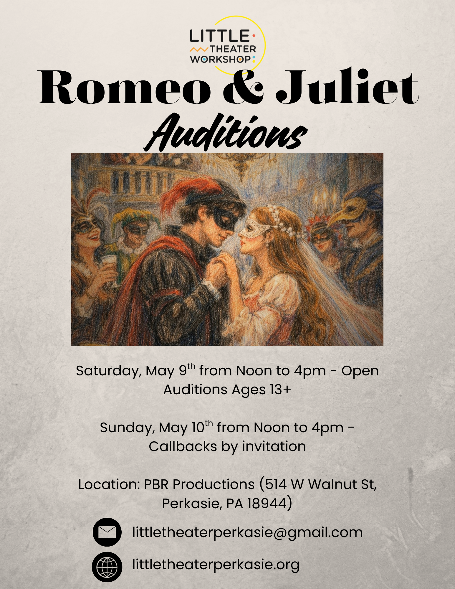Little Theater Workshop is seeking actors for our summer production of Romeo & Juliet, to be performed on the grounds of the Pearl S. Buck House. Actors of all experience levels are encouraged to audition.